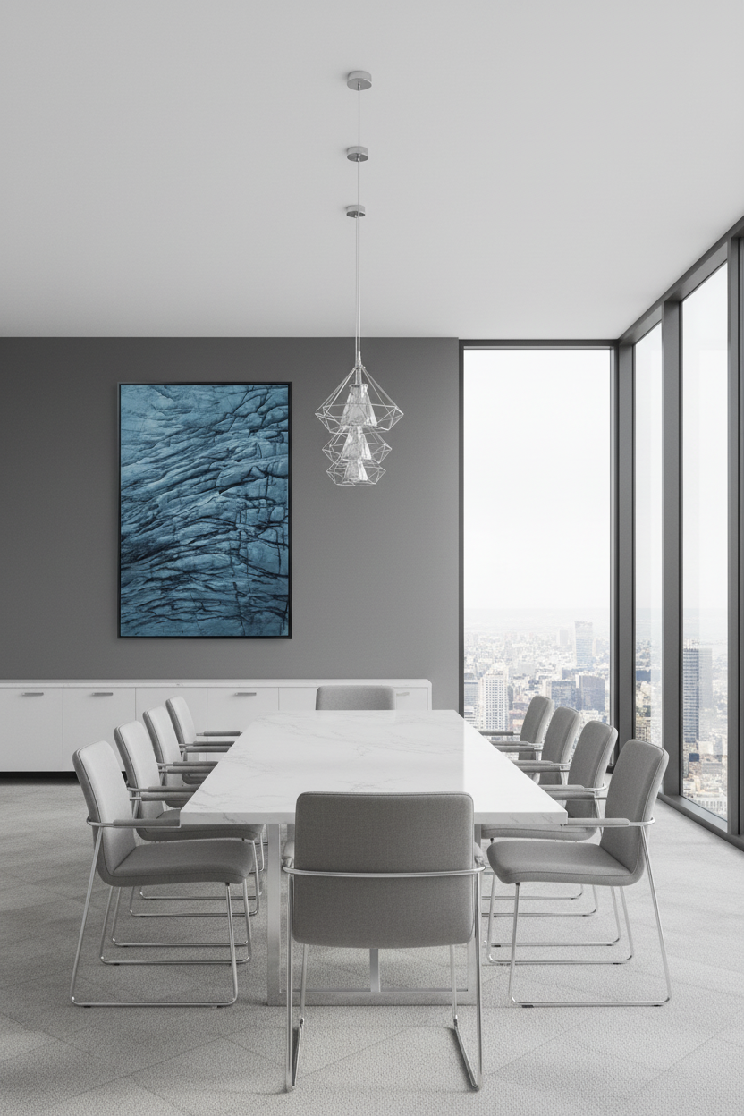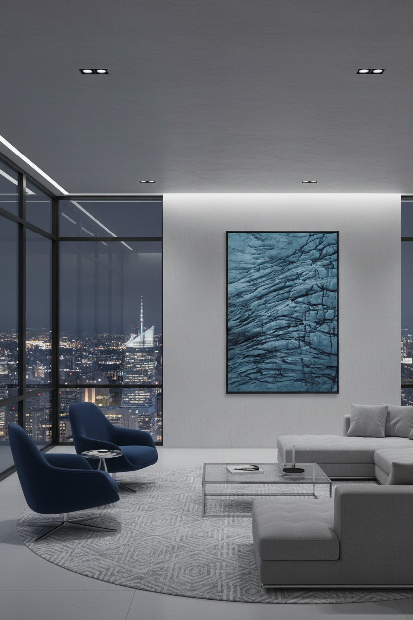 Printed in large format, the work reveals its full impact — ideal for modern living or business environments, galleries, reception areas, and hotels with a minimalist or architectural design. Its refined texture and restrained tones integrate seamlessly into contemporary interiors while creating a strong visual statement.
