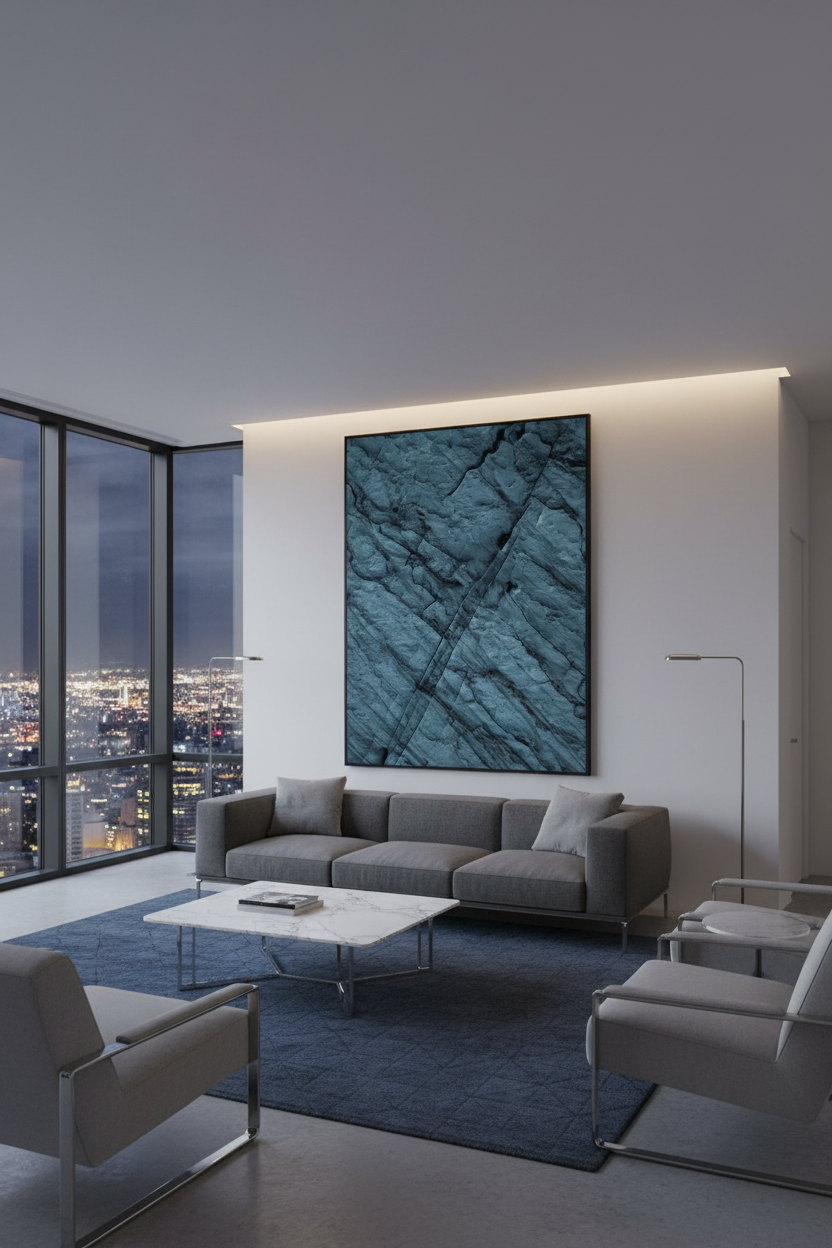 Printed in large format, the work reveals its full impact — ideal for modern living or business environments, galleries, reception areas, and hotels with a minimalist or architectural design. Its refined texture and restrained tones integrate seamlessly into contemporary interiors while creating a strong visual statement.