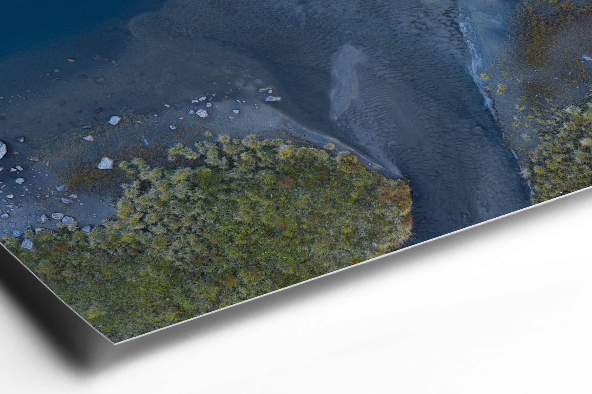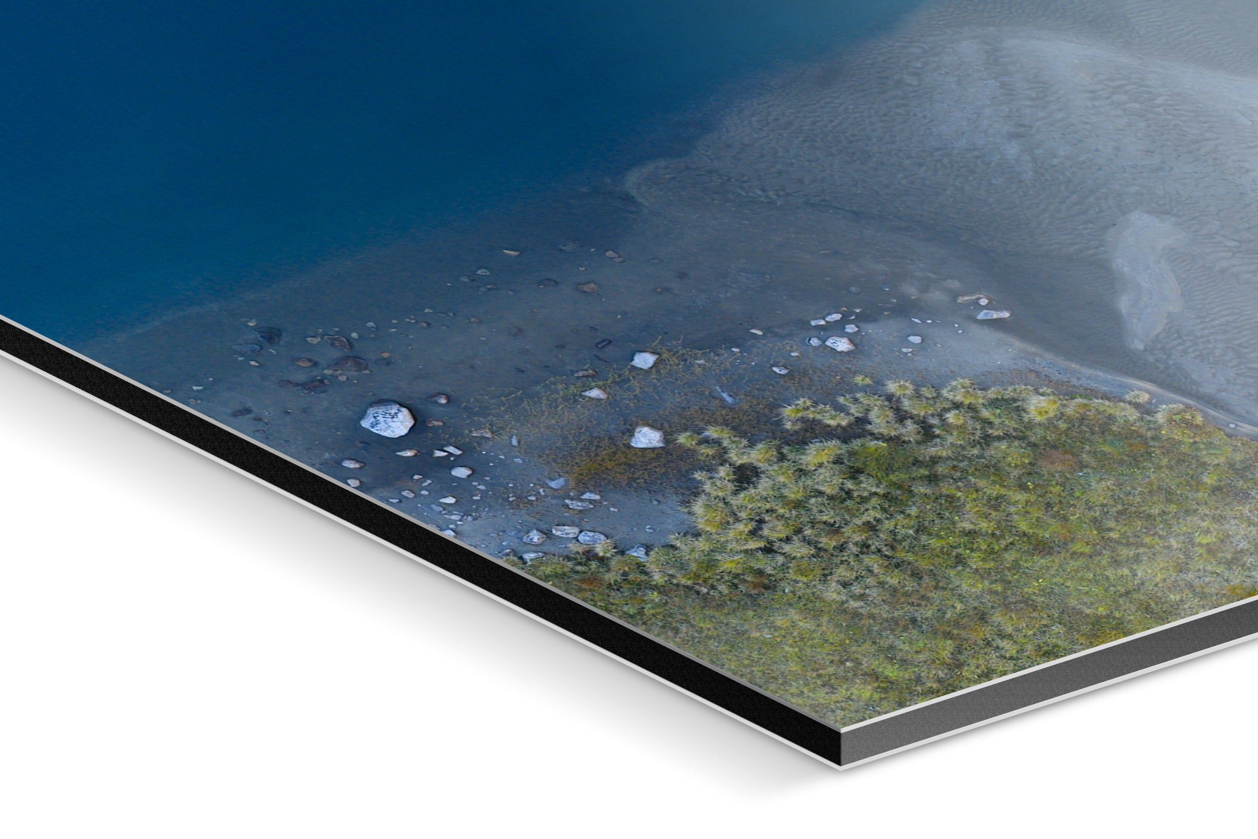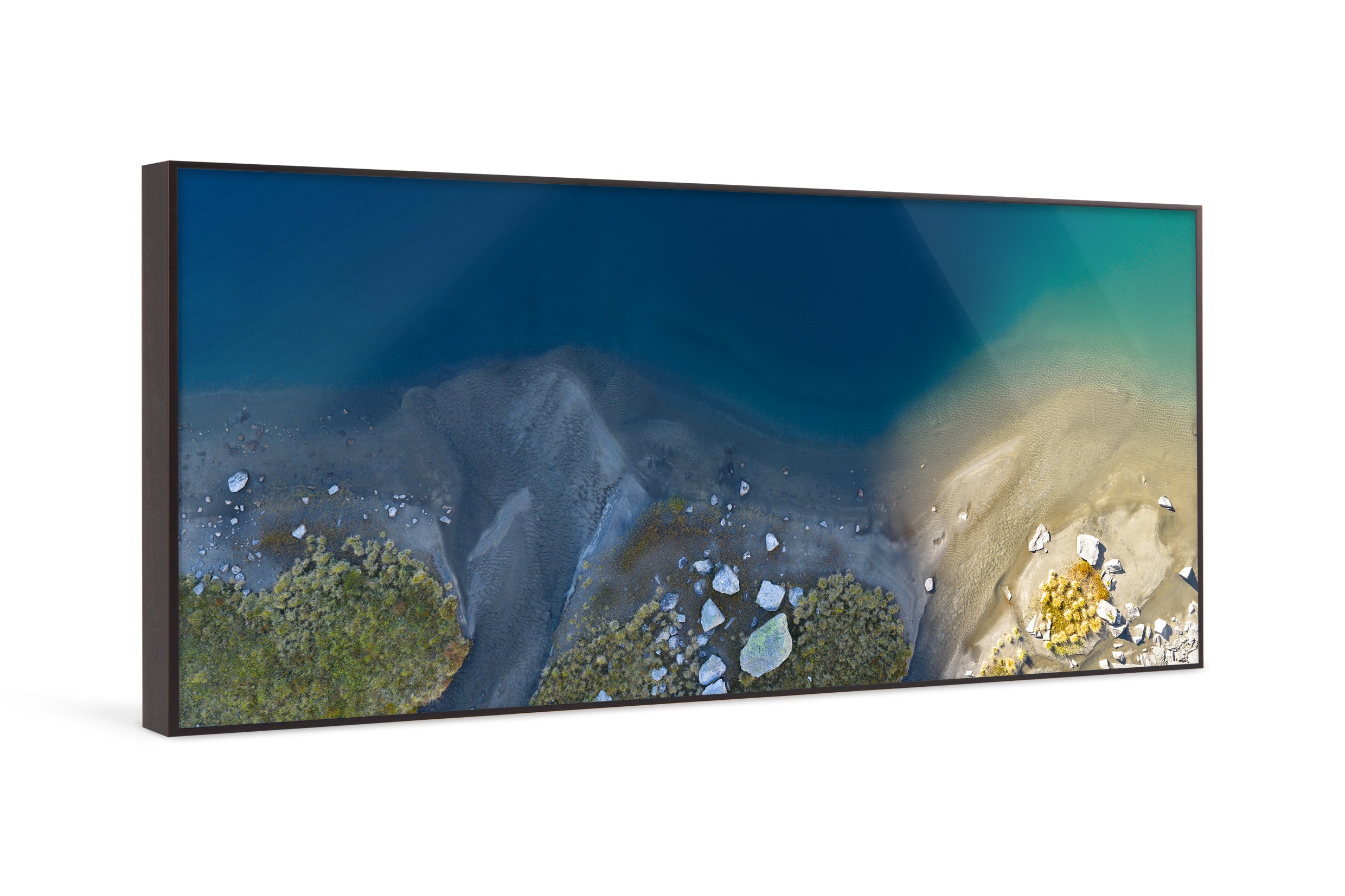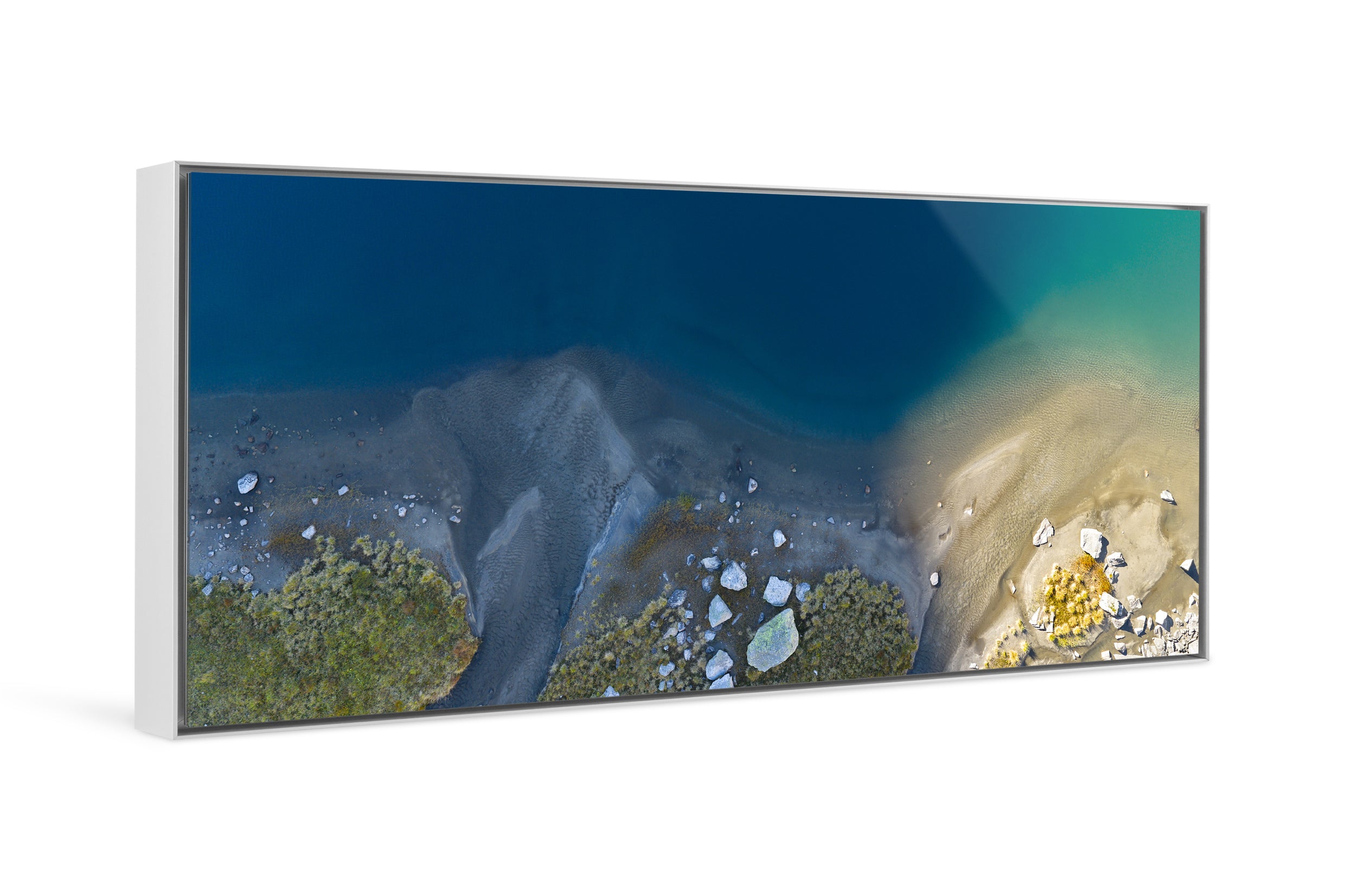 Aerial view showing the subtle transition between deep blue water, pale sand, and alpine vegetation. The image reduces the landscape to form, color, and texture. Natural gradients, scattered stones, and fine ripples create an abstract composition that blurs the line between photography and painting. A study in balance and restraint suited to Fine Art presentation.