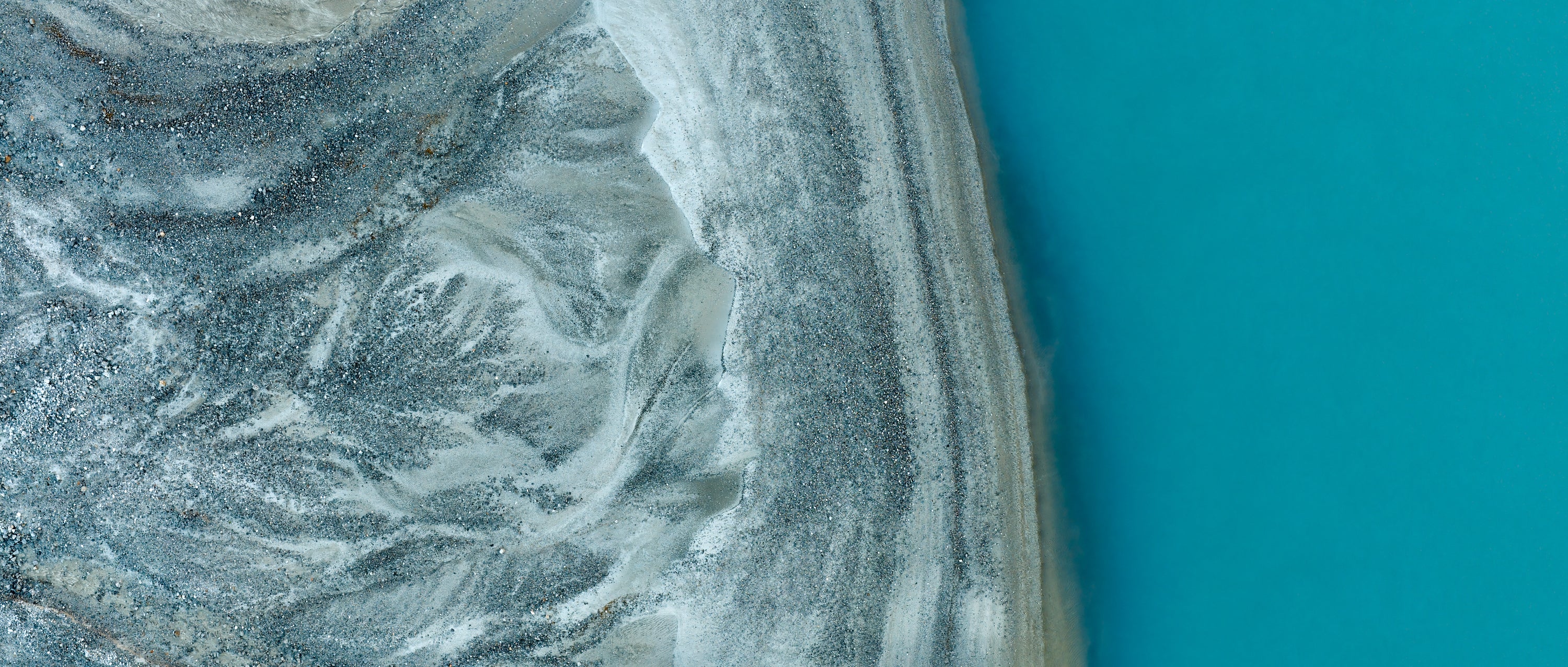 Taken just before sunrise, Glacial Shore #6 captures the landscape in the quiet tension between night and day. The deep turquoise of the lake meets the cool, textured sediment of the shoreline — a surface shaped by time, water, and the slow rhythm of erosion.