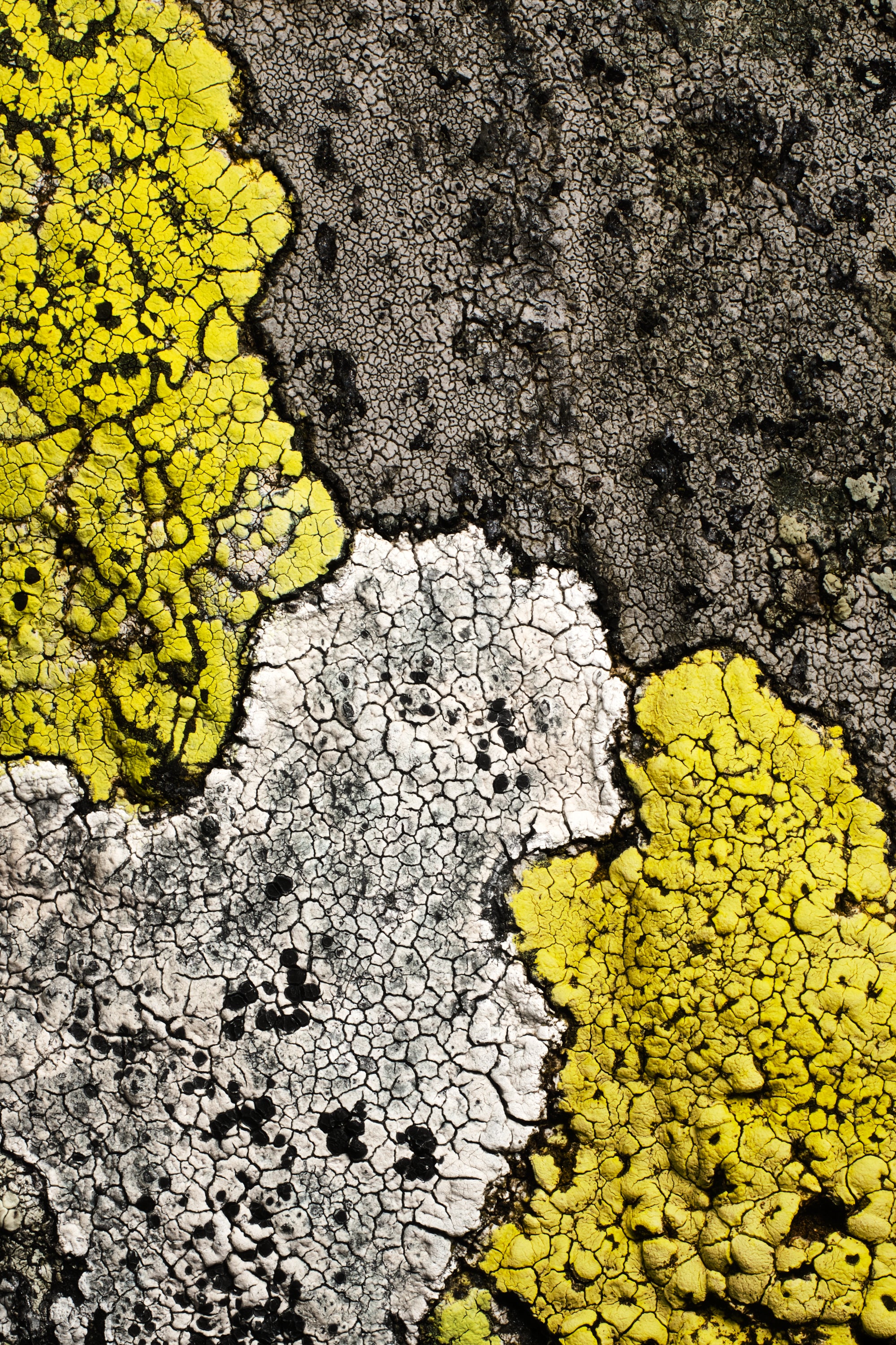 Four lichen colonies meet on a single piece of alpine rock, each claiming territory with its own color and texture. Yellow-green, white, grey, black. Crackled surfaces layered over millennia, arranged by nature with the precision of an abstract painter.