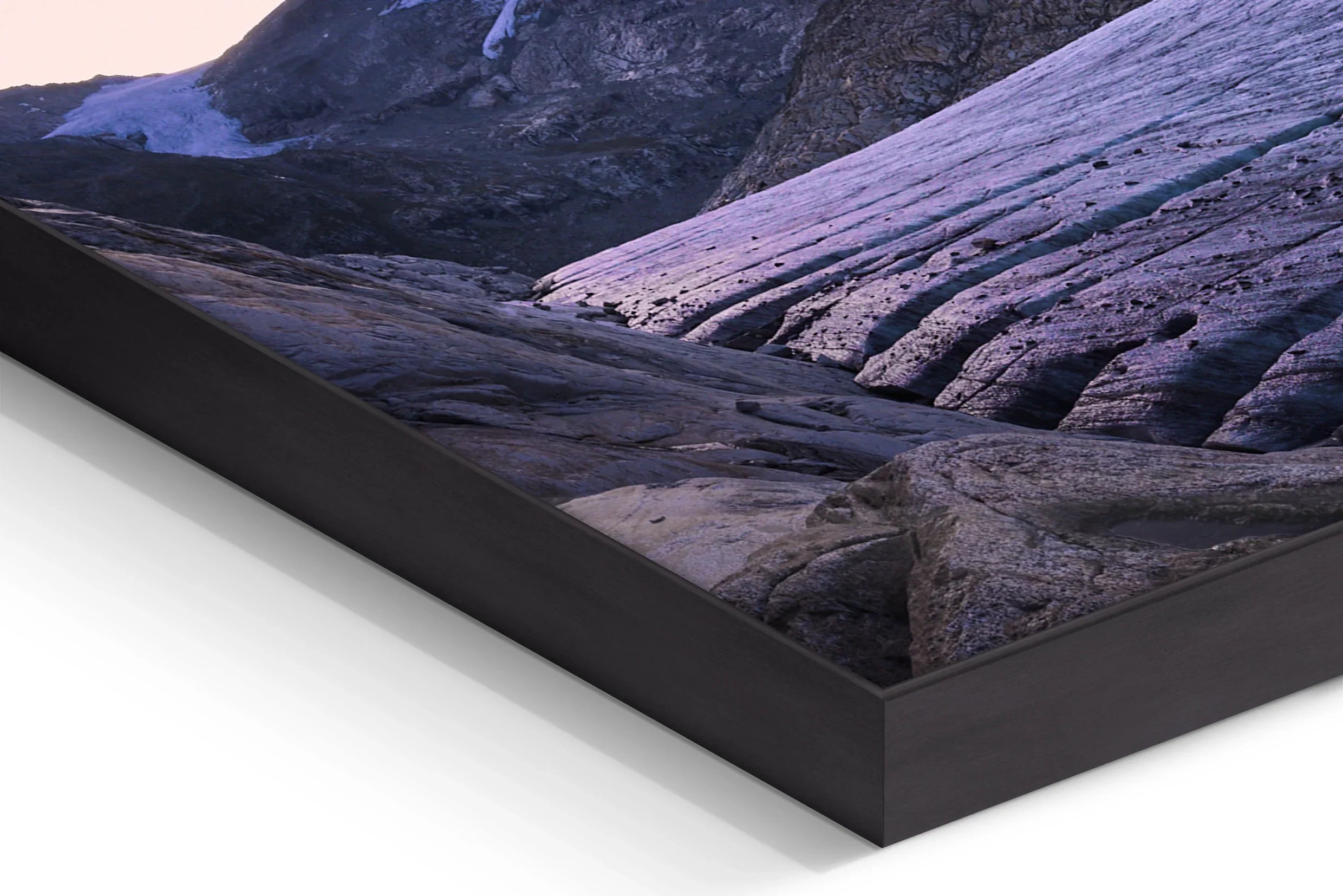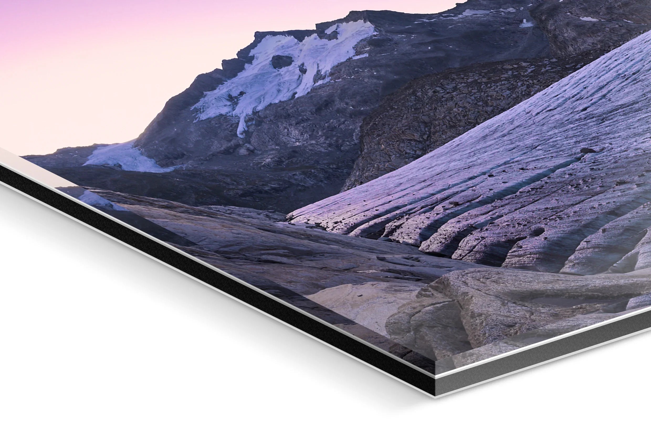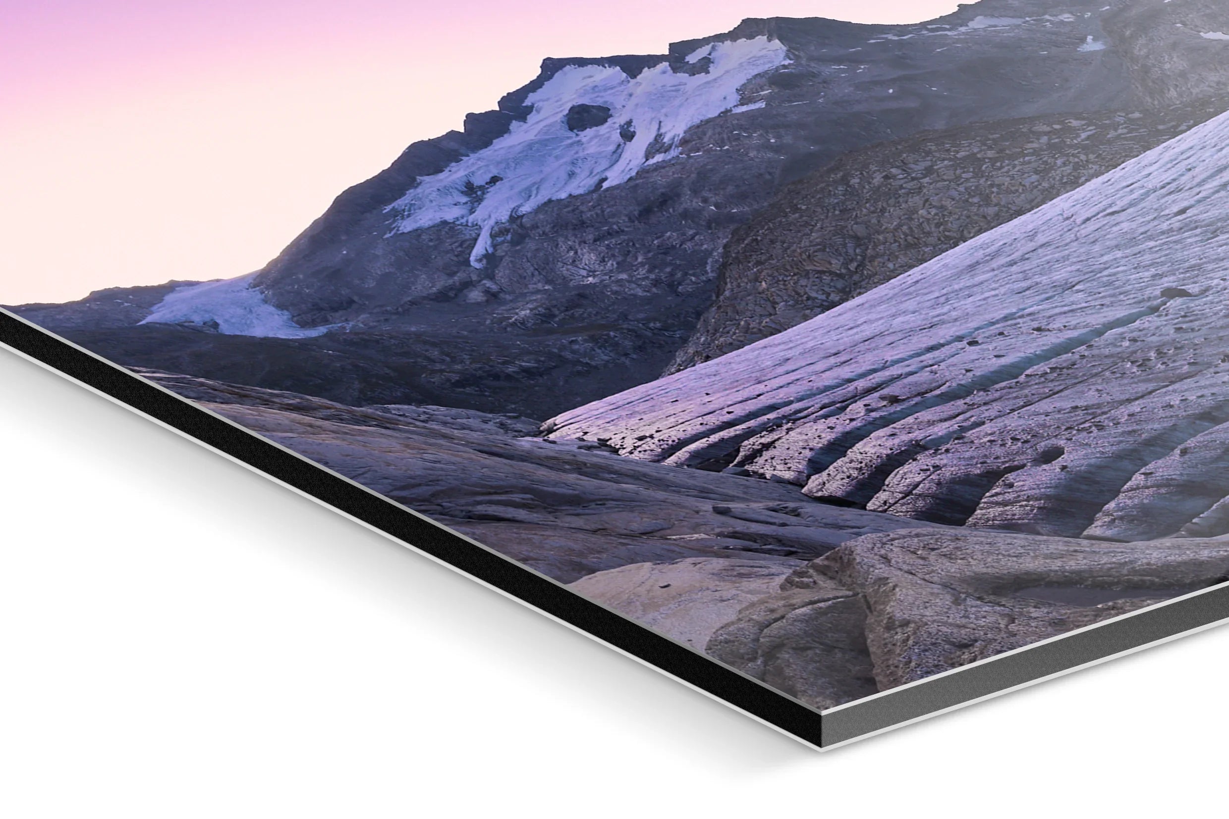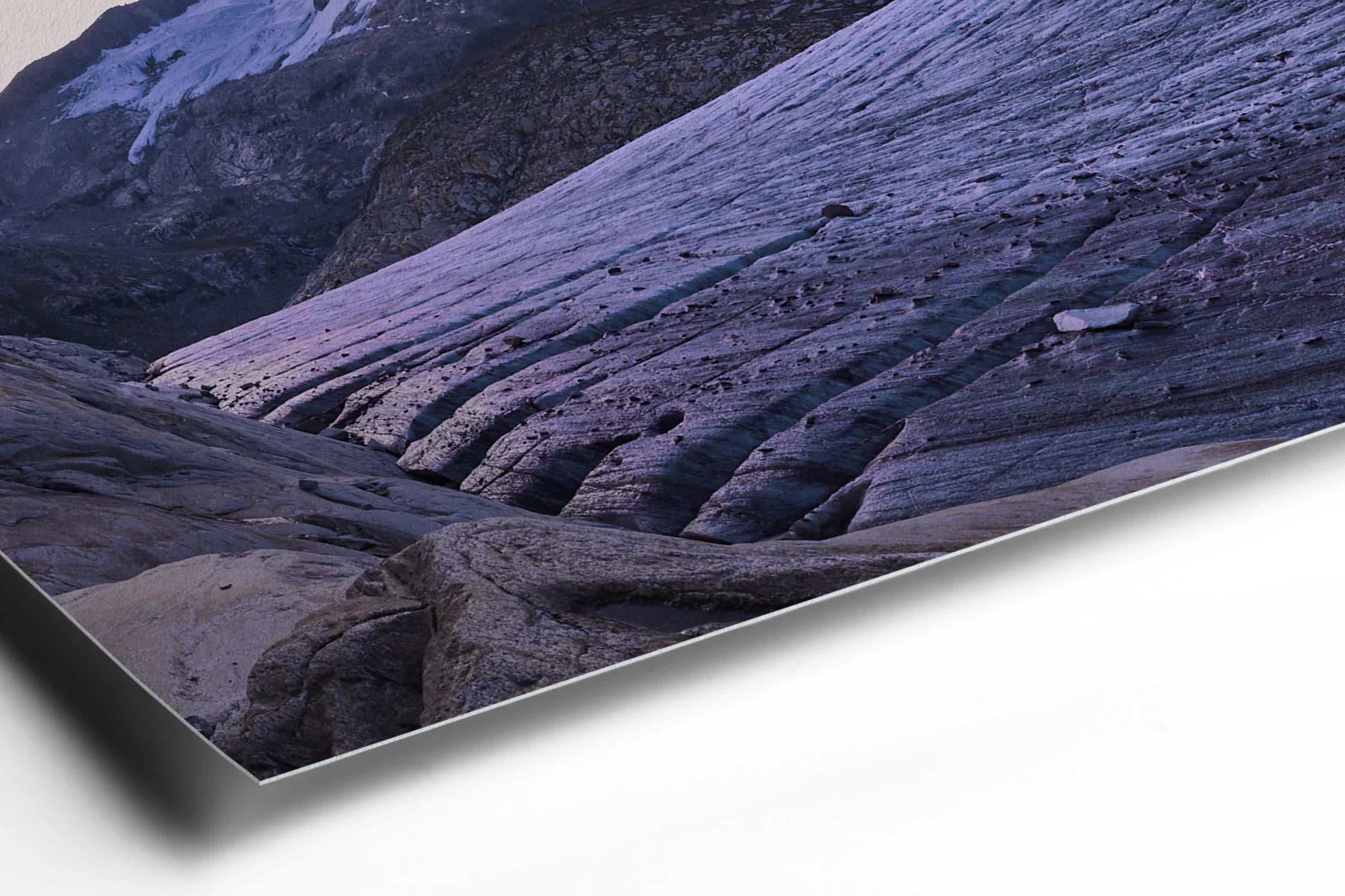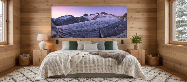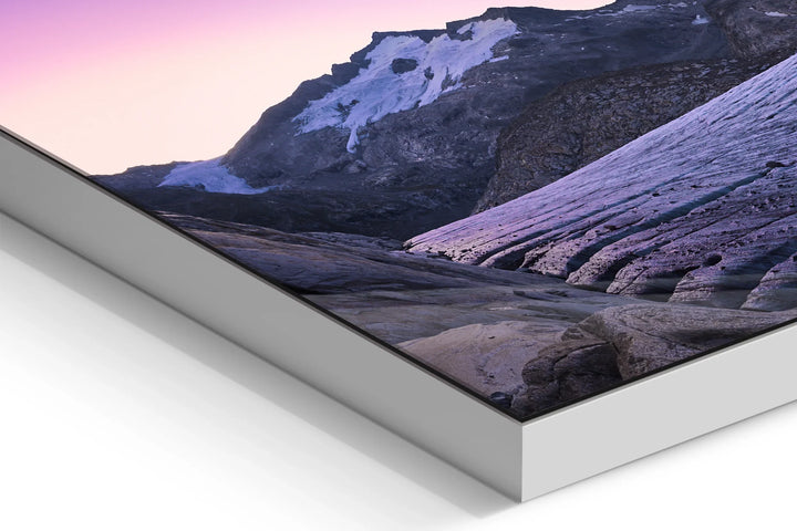 "Morning Light on Ice" is a captivating fine art photograph that transports the viewer to the majestic solitude of a glacier at dusk. The serene lavender hues of the sky envelop the rugged peaks, their snow-capped summits softly illuminated by the gentle embrace of fading daylight. This exquisite composition highlights the graceful, undulating lines of the glacier, etched with time and resilience, leading the eye across the vast expanse of this natural wonder. The mood is both calming and profound, invoking a deep sense of introspection and awe. The interplay of light and shadow creates a dreamlike atmosphere, inviting the observer to pause and embrace the quiet strength of nature. This piece stands as a testament to the ephemeral beauty of our planet, making it a highly desirable addition for discerning collectors who seek both exclusivity and artistry. The photograph's dynamic yet tranquil essence ensures it will be a cherished centerpiece, offering inspiration and serenity to any fine art collection.
