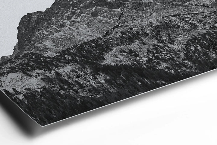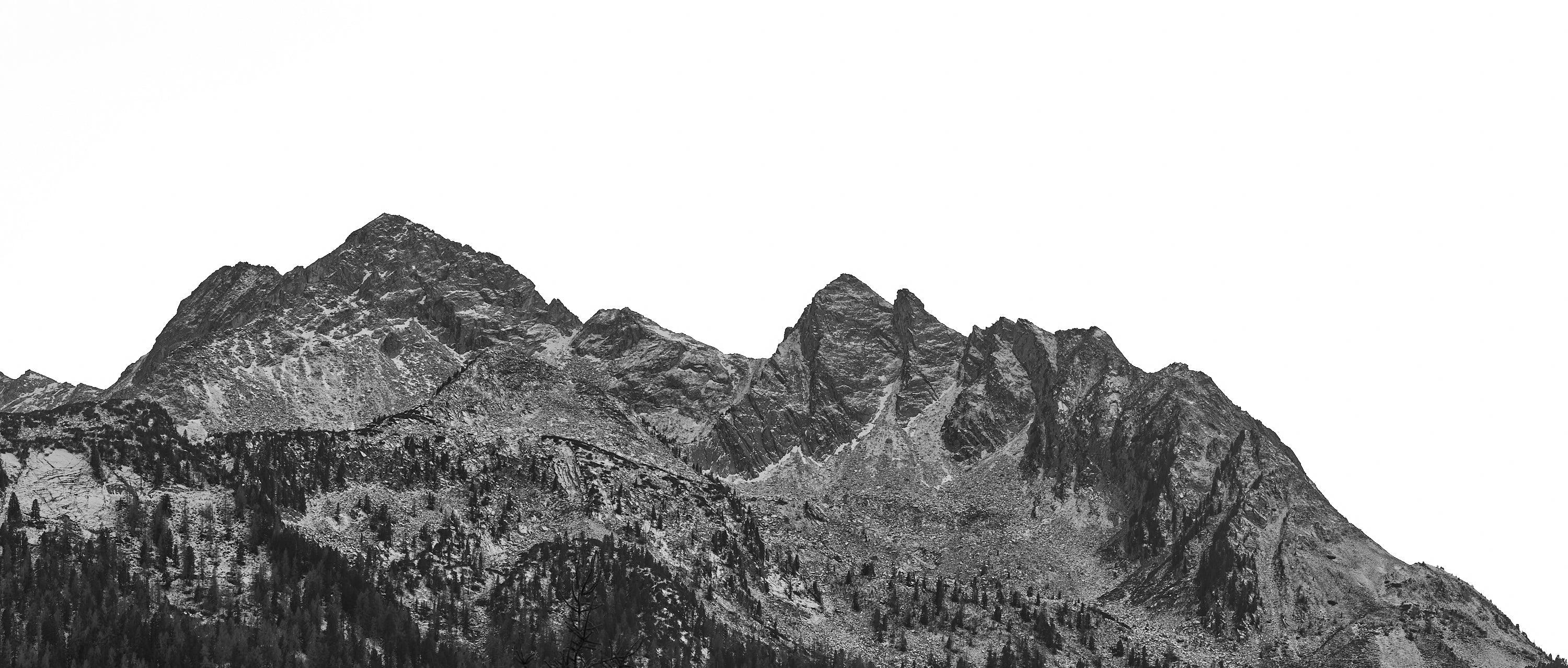 A monochrome portrayal of a rugged mountain ridge, its jagged peaks etched sharply against a stark, cloudless sky.