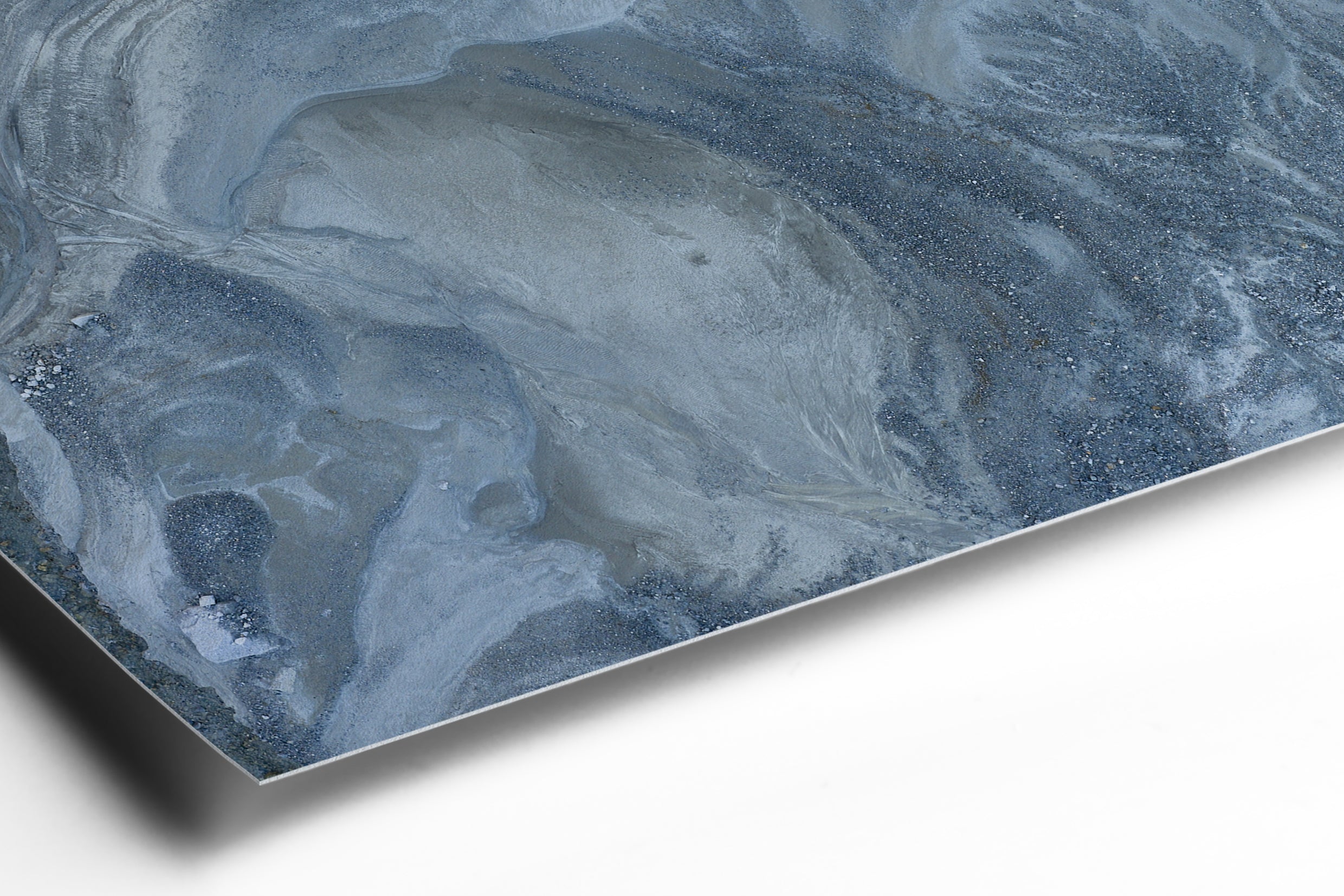 In the absence of direct sunlight, the scene reveals a restrained palette of greys and blues, each tone softened by the diffuse light of dawn. Subtle patterns in the sediment resemble brushstrokes, transforming the terrain into an abstract composition that feels both natural and painterly.