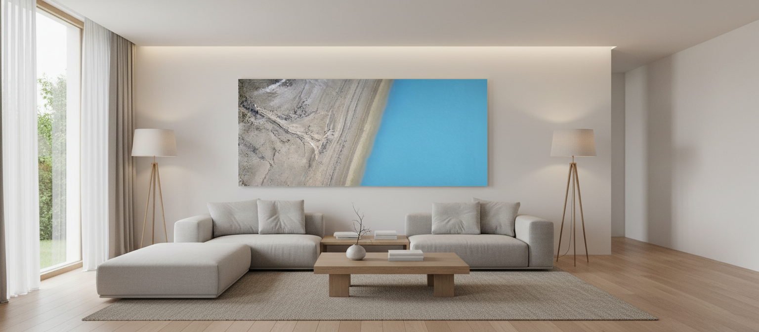 As a large-format print, the image reveals a meditative calm and painterly detail, inviting the viewer to linger in the serene transition between elements — a landscape reduced to its purest forms of color, light, and time.